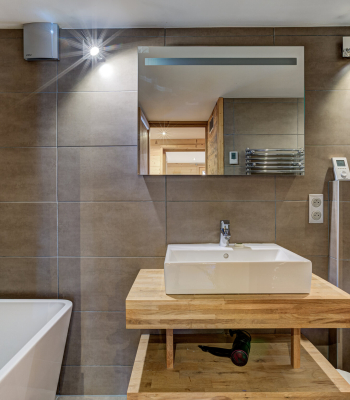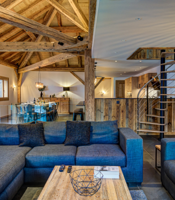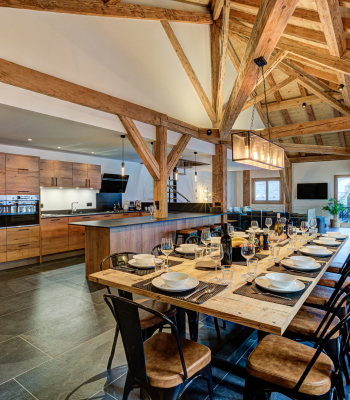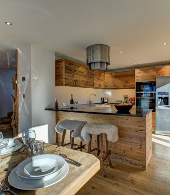 There is a large open plan kitchen, living and dining area with a beautiful locally designed dining table to enjoy those evenings in with friends and family. The chalet comes equipped with 2 dishwashers, 2 ovens, coffee machine and all the kitchen essentials you would expect from a luxury chalet. There is a boot room area with shelving and heated boot warmers to make sure your kit dries thoroughly before your next day out on the mountains.